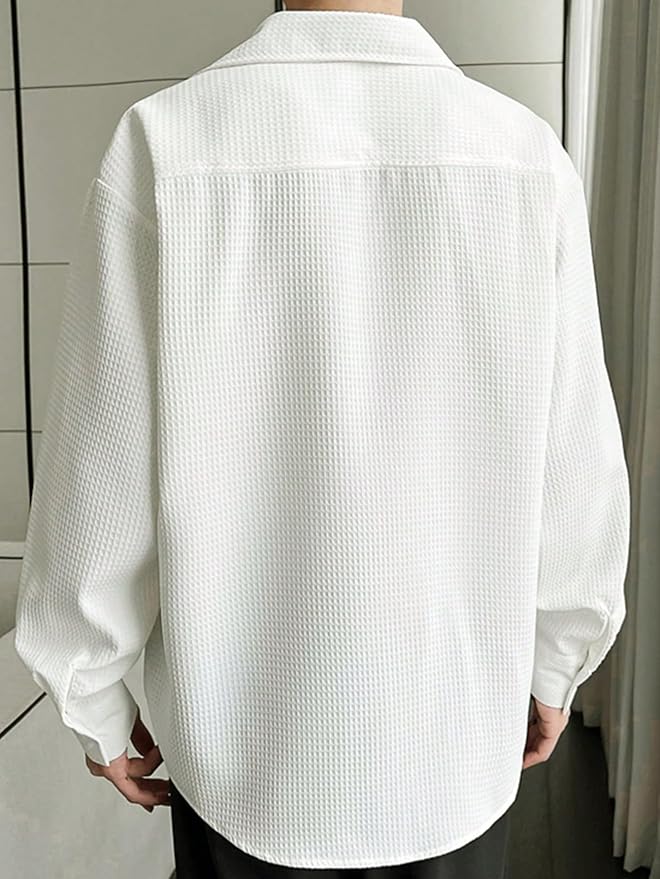 Textured Fabric: Waffle-knit texture adds a unique and stylish touch to the classic shirt. Classic Button-Down: Features a full button front with a sharp collar for a polished look. Perfect for Layering: Ideal to wear over a tee or under a jacket for multiple styling options. Relaxed Fit: Loose silhouette offers comfort and a laid-back vibe. Everyday Wear: Lightweight, breathable material perfect for all-day wear in any season.