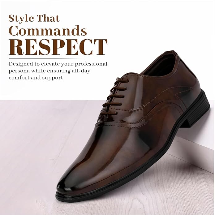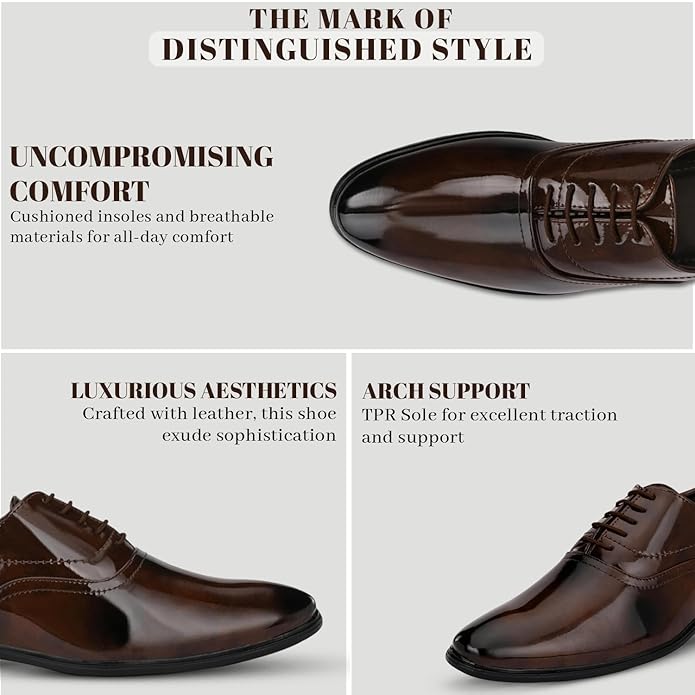 MATERIAL: Synthetic | Outer Material - Synthetic Leather | Sole Material - TPR (Thermoplastic Rubber) CARE INSTRUCTIONS: Wipe gently with a dry cloth to remove any dried-on dirt and dust COMFORT: Designed with support and comfort in mind, formal shoes often feature cushioned insoles, arch support, and breathable materials to ensure all-day comfort. PROFESSIONAL APPEARANCE: They enhance one's overall appearance, making a strong impression in formal environments such as offices, meetings, and business events. LIFESTYLE: Formal Shoes | Closure - Lace Up