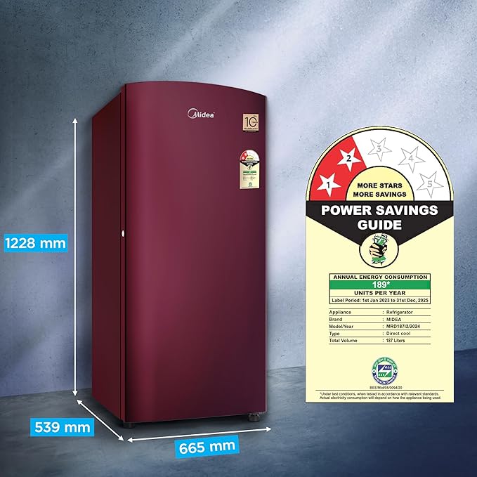 Product Dimensions 66.5D x 53.9W x 122.8H Centimeters Brand Midea Capacity 187 litres Configuration Freezer-on-Top BEE Star Rating 2 Star