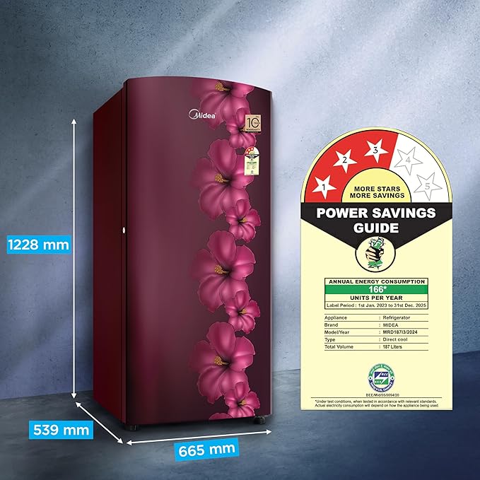 Product Dimensions 66.5D x 53.9W x 122.8H Centimeters Brand Midea Capacity 187 litres Configuration Freezer-on-Top BEE Star Rating 3 Star