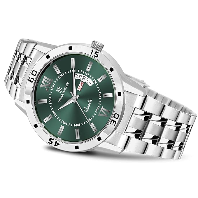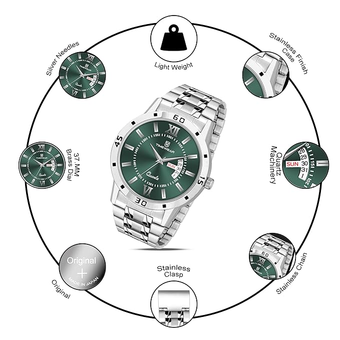 Stainless Steel Chain | Stainless Steel Back | Water Resist Premium Day Date Watch | Japanese Quartz Movement | Battery: 100% Original | Life: 2/3 Years Package Includes:1 Watch | Company Box | Warranty Card | Gst Paid Bill Analog Watch for Men | Recommended for age 14 & Above