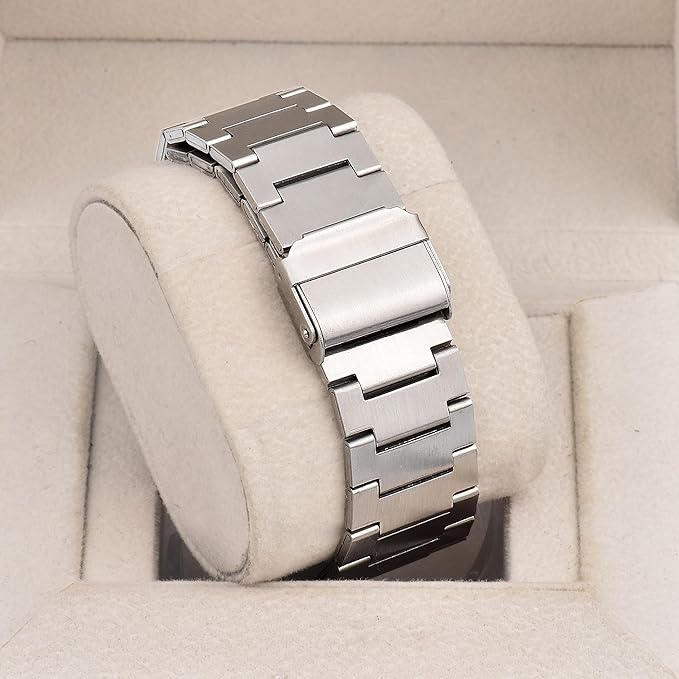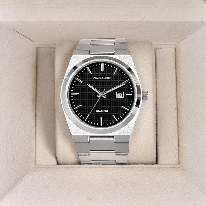 STYLISH TIMEPIECE: This stainless steel watch features a sleek silver tone case and bracelet with applied indices and three hands for quick time checks. DURABLE CONSTRUCTION: Crafted from high-quality stainless steel, this watch is built to last with scratch resistant mineral glass and 50 meters water resistance. COMFORTABLE FIT: The bracelet features an adjustable clasp allowing it to be sized for a comfortable yet secure fit on wrists measuring up to 8 inches in circumference. CLEAR DIAL DISPLAY: The silver tone dial has applied hour markers and hands with good visibility to allow easy reading of the time in any lighting conditions. SIX MONTH WARRANTY: SWADESI STUFF backs their watches with a six month warranty providing peace of mind from defects in craftsmanship.