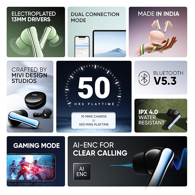 | wireless Bluetooth earphones MIVI DuoPods A850 are proudly made in India. These earbuds are built locally to compete globally. 1 year warranty from the date of purchase. |