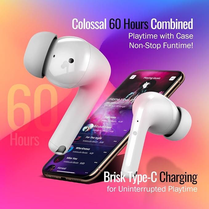 | 10m strong wireless connectivity & Wide compatibility with Phones/tablets; Stereo & Mono bud Use capability | Snug fit & lightweight earbuds with passive noise cancellation | Precise touch controls | Voice assistant ready | Type-C fast charging case | IPX5 Water-resistant Integrated music/call controls | Just 1 hour Earbuds charge time | 400mAh on-the-go charging case for extended playtime | 1.5hrs charge time | 1-Year manufacturer warranty on manufacturing defect only Caution | Using incompatible USB cable or high voltage chargers can damage the product & void the product warranty. We strongly recommend using DC5V-1A chargers & the USB cable included in the package. Battery Average Life |