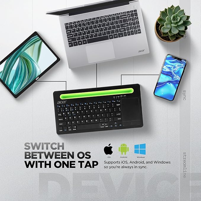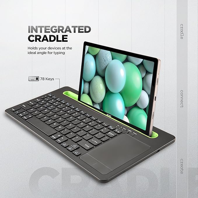 Brand Acer Compatible Devices Laptop, Smartphone, Tablet Connectivity Technology Bluetooth Keyboard Description Upgrade your productivity with the Acer Multi-Device Wireless Keyboard, a compact and sleek solution built for multitaskers on the go. Designed for laptops, tablets, smartphones, and desktops, this keyboard features Bluetooth 5.0 connectivity, a responsive touchpad, and an integrated cradle to support your devices — all in one portable unit. Whether you're switching between devices or typing on a tablet, the dual channel switch lets you toggle effortlessly. The 78-key layout offers a quiet and smooth typing experience, while the Pixart chip ensures accurate response and control. Powered by a built-in rechargeable 180mAh battery, the keyboard runs for up to 28 hours of continuous use and holds a standby time of over 6 months. Recharging is easy via a USB-C port, and the durable ABS body ensures it’s built to last.Upgrade your productivity with the Acer Multi-Device Wireless Keyboard, a compact and sleek s… See more Recommended Uses For Product Everyday Use, Multimedia, Personal