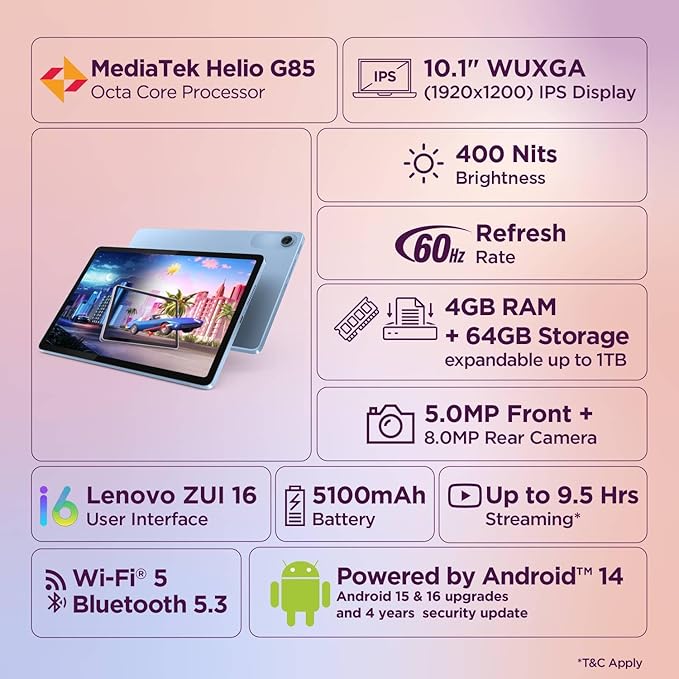 Brand Lenovo Model Name Lenovo Tab Memory Storage Capacity 64 GB Screen Size 10.1 Inches Display Resolution Maximum 1920x1200 Pixels