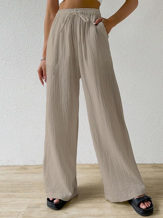 STYLE: Wide leg casual pants featuring a relaxed silhouette with full-length design and H-shape cut for maximum comfort WAISTBAND: Elastic waist with adjustable drawstring closure ensures a customised, secure fit for all-day wear MATERIAL: Textured fabric with vertical ribbed pattern offers breathability and a flattering drape perfect for daily wear VERSATILITY: Suitable for spring/fall seasons, these black pants pair effortlessly with casual tops for everyday outfits DESIGN FEATURES: Convenient side pockets, straight-leg cut, and loose fit make these pants ideal for casual daily activities