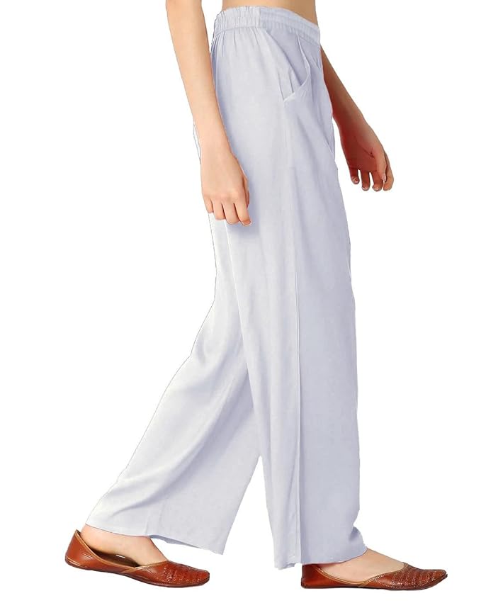 Our Palazzo is made from the super-combed cotton and reyon material. The material is bio-washed (organic washed) that is completely harsh-less chemicals; hence the Palazzo has a longer fabric life Our palazzos feature a mid-rise waist, Drawstring Closure and elasticized waistband with a concealed Hanging hook and side pockets. Designed full-length, our Cotton Rayon palazzos have solid spray which adds a contemporary look to your ensemble, making it perfect for any occasion Fit: The drawstring waist and wide leg design of these palazzo pants provide a comfortable and flattering fit. The pants also have 1 deep side pocket for convenience Pair our Palazzos with a button-up shirt or a kurta for a chic and elegant look that's suitable for any occasion Care Instructions- Hand wash or machine wash in cold water & mild detergent. Do not bleach. Do not tumble dry, line dry in the shade. Wash dark colors separately. Use iron on a low setting