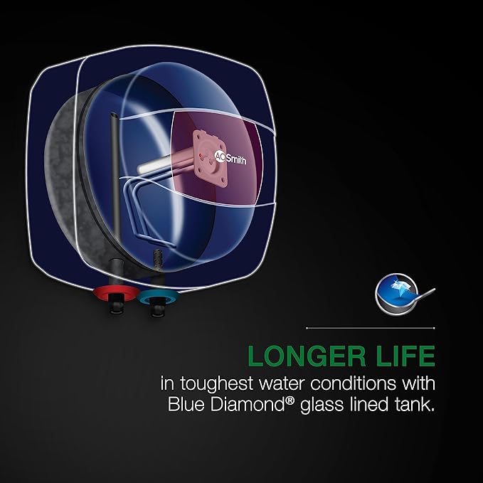 | ensuring safe and reliable hot water for your bathroom every day. DURABLE & ELEGANT DESIGN | This AO Smith 15-liter water geyser is crafted with a glossy ABS plastic body and blue diamond glass-lined tank for 2X corrosion resistance |