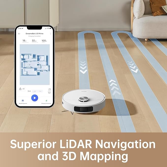 | or carpets ?LDS Navigation&3D ??Mapping?The Dreame L10 Prime vacuum robot LDS technology plans the route intelligently to avoid repeating cleaning processes for effective cleaning; With 3D maps in the APP | |