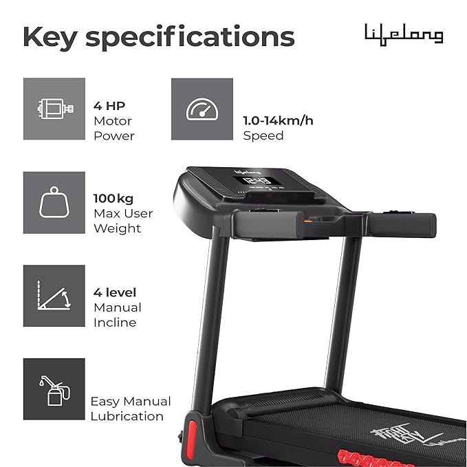 Lifelong FitPro Motorized Treadmill for Home (4HP Peak) | 3-Level Manual Incline | Rubberies Shock Absorption | Foldable Hydraulic | 12 Preset Workouts | 14km/hr | 100Kg | Bluetooth (LLTM033)