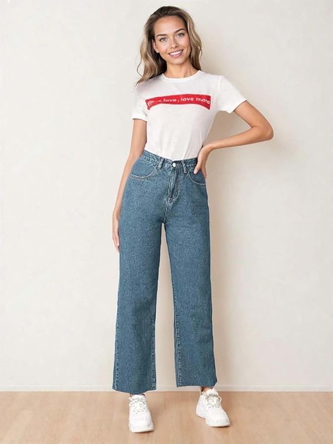 Women’s High Waist Wide Leg Button Coin Pocket Straight Fit Jeans Stylish Regular to Plus Size Fit Denim Jeans for Women